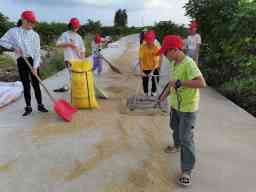 体验捡拾稻穗的辛苦后,同学们又开始帮贫困户收装晒干的稻谷。大伙推的推,扫的扫,装的装,忙的满头大汗,很快农户家所晒的稻谷收拾干干净净。