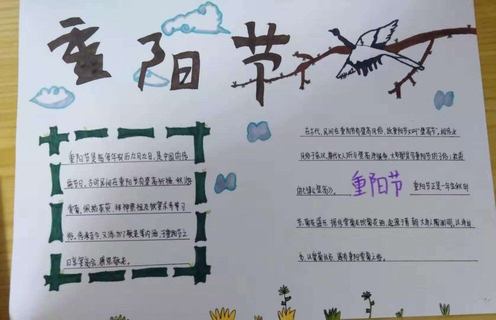 今年重阳节恰逢国庆节,学校要求学生在国庆假期帮助长辈做一些力所能及的家务劳动,给长辈们分享自己的学习乐趣,听他们讲一讲过去的故事。以此培养学生们敬重老人,关心老人的良好品质,弘扬中华民族的尊老敬老的优良传统。通过手抄报制作,撰写爱亲感言,激发了学生们孝老爱亲的内在自觉,懂得了敬老爱老的重要性,进一步唤起了少先队员们尊老、爱老的意识。(徐林娜)
