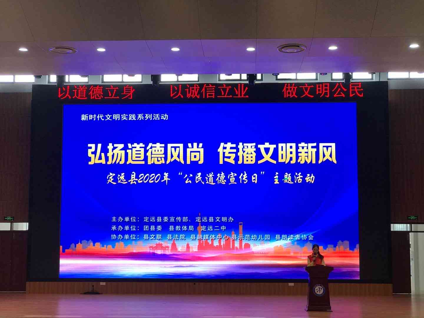~ 9月19日上午9时,在第十八个全国“公民道德宣传日”到来之际,由定远县委宣传部、县文明办主办的定远2020年“公民道德宣传日”主题活动在定远二中报告厅拉开帷幕。县人大常委会副主任孟庆报、县政协副主席方世根和定远县团县委、定远县教体局 、定远二中相关单位负责人一同出席活动。