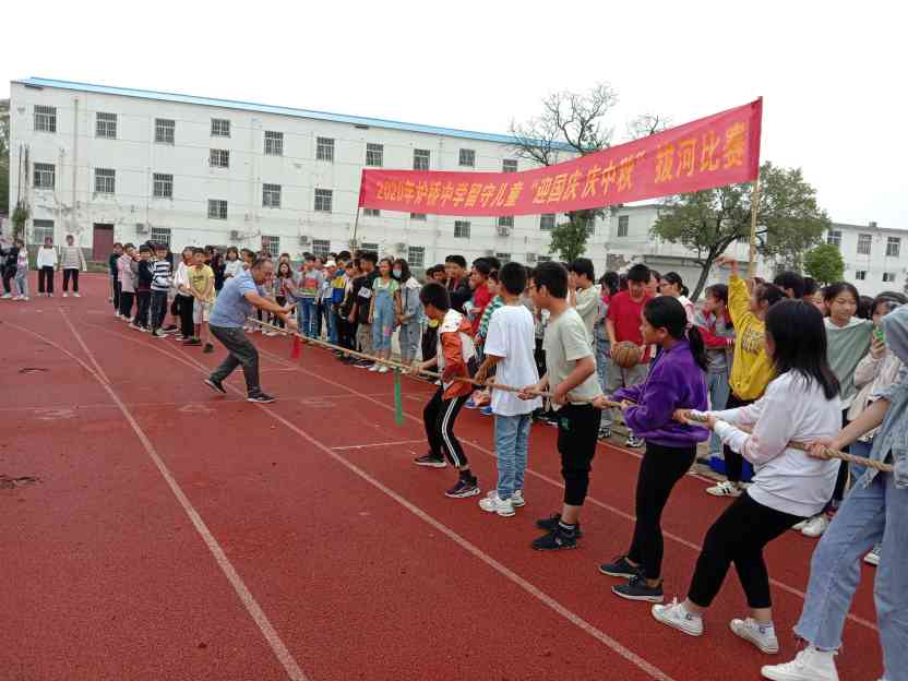 ~ 为进一步做好留守儿童心理健康教育管理工作,促进其身心健康发展,培养他们团结、互助、合作、进取精神,增强其自信心。在国庆、中秋双节到来之际,9月29日上午,定远县炉桥中学团委在学校操场组织开展了“迎中秋 庆国庆”拔河比赛。