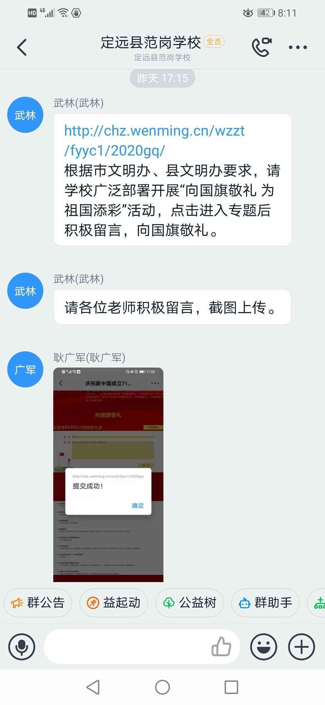 ~ 该校德育处通过工作群发出号召后,全体教师纷纷参与,积极留言,向国旗敬礼、为祖国点赞;学生以班为单位组织网上签名寄语。由信息老师带领三至九年级学生,登录滁州文明网页面,进行网上签名寄语活动。一条条寄语热情抒发了对伟大祖国繁荣昌盛、和谐富强的衷心祝愿,表达了对祖国母亲的热爱与赞美!(陈从好)
