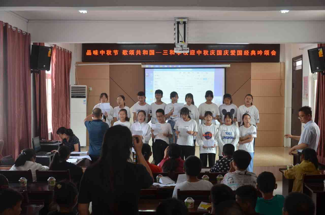 9月30日下午,伴随着一阵高昂激越、铿锵有力的国歌声,“品味中秋节、歌颂共和国”——三和学校迎中秋庆国庆爱国经典吟颂会在该校综合楼道德讲堂拉开帷幕。