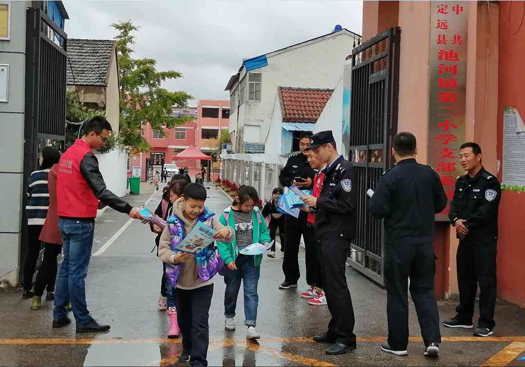 ~ 活动现场池河派出所民警同志利用宣传展板,宣传彩页等形式开展普法宣传,以真实典型事件为案例,向各位老师、同学、家长详细的讲解了影响校园安全的黑恶势力;影响学生健康成长的校园欺凌行为;滋扰学校周边治安环境的电信、网络诈骗行为等。