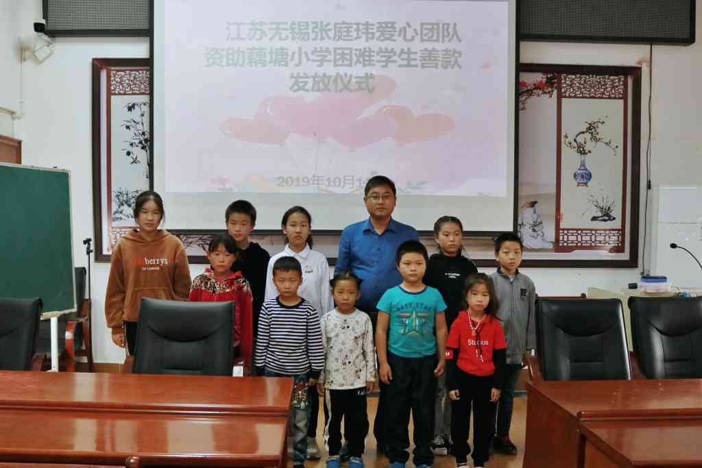 10月11日下午3时,藕塘小学举行2019年江苏无锡张庭玮爱心团队资助藕塘小学困难学生善款发放仪式,10名贫困学生喜获无锡北创科技公司捐赠的5000元爱心善款。