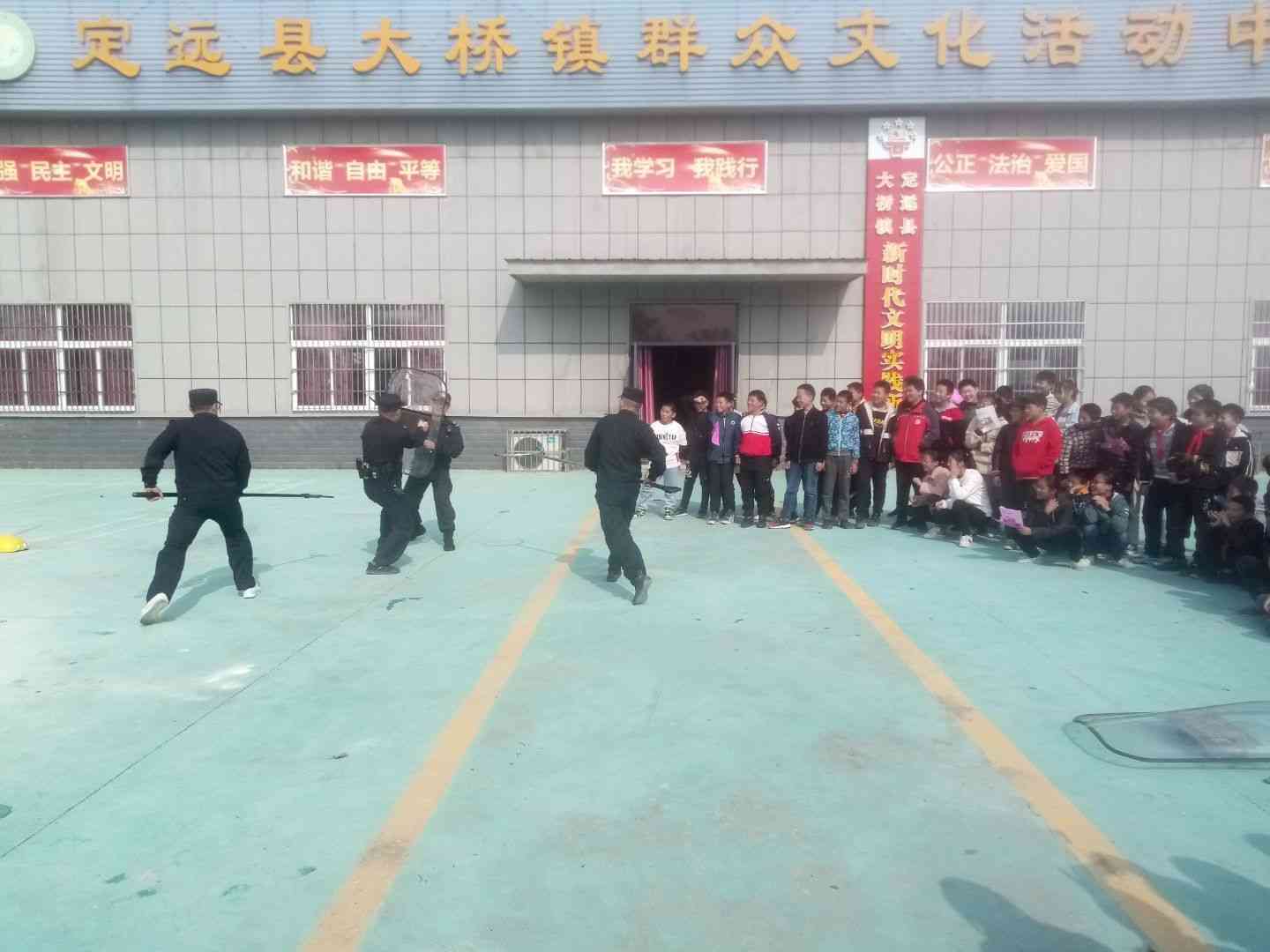 活动中, 定远县消防大队宣传员为同学们详细讲解了预防火灾的基本常识和应急处置方法,逃生绳、逃生锤、干粉灭火器等常用消防器材的正确使用方法,让学校师生们亲生体验灭火器如何正确使用,并发放了消防安全知识手册和宣传单。同时,大桥派出所民警向同学们展示了枪械、防暴队牌等警用装备,逐一介绍了各种装备的使用方法,开展了反恐防爆演练。