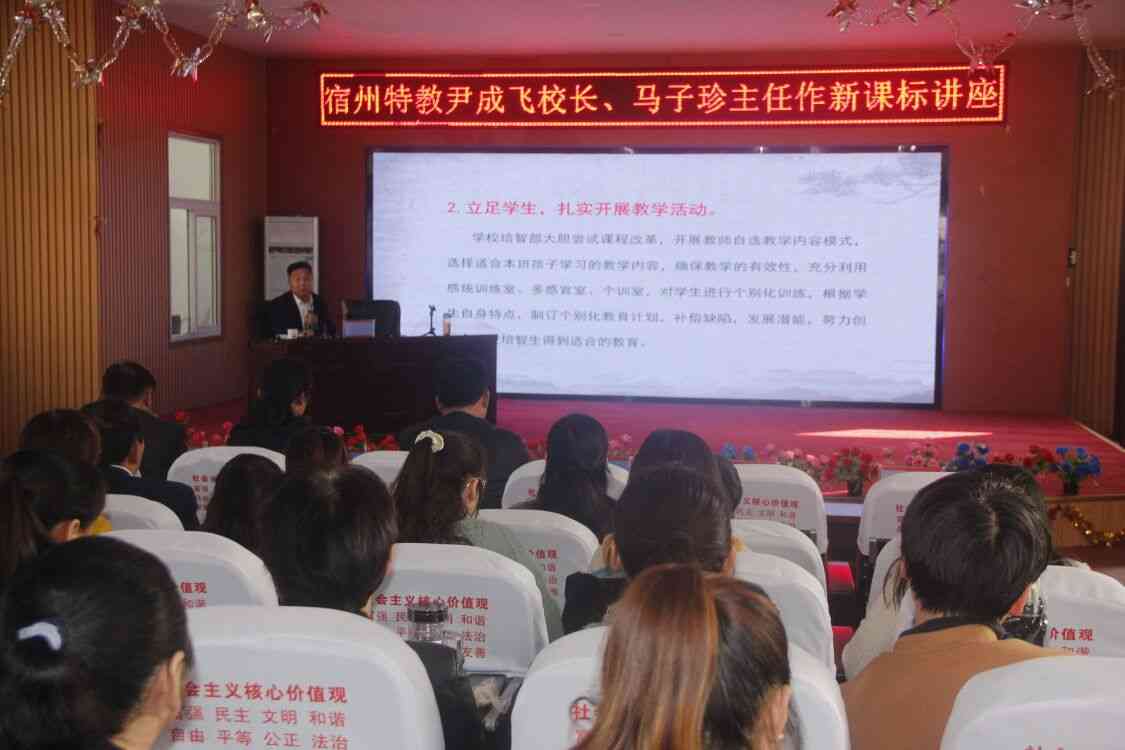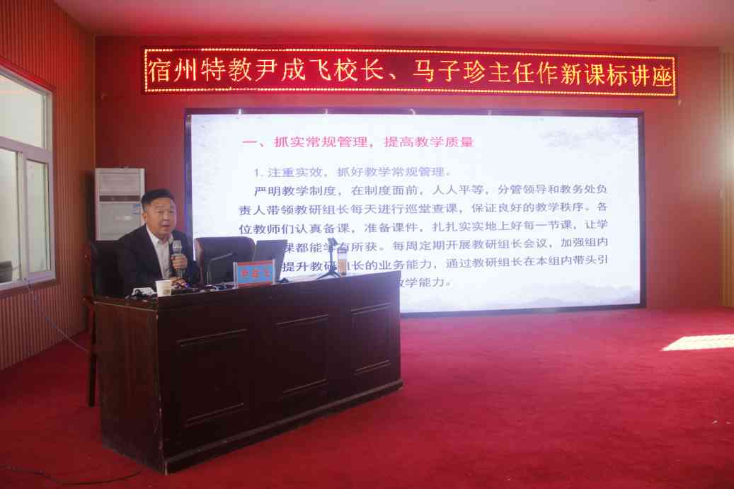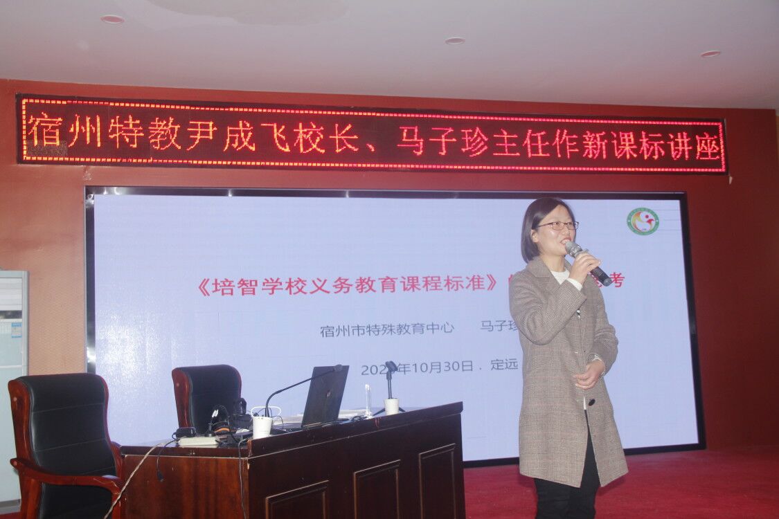 ~ 10月30日下午,定远县特教学校邀请宿州特教学校校长尹成飞、教研室主任马子珍来到学校,开展“专家引领明方向、传经送宝促提升”专题讲座,全体教师认真聆听专题讲座。滁州市特殊教育中专学校、全椒县特教学校部分领导和教师也聆听了专题讲座。