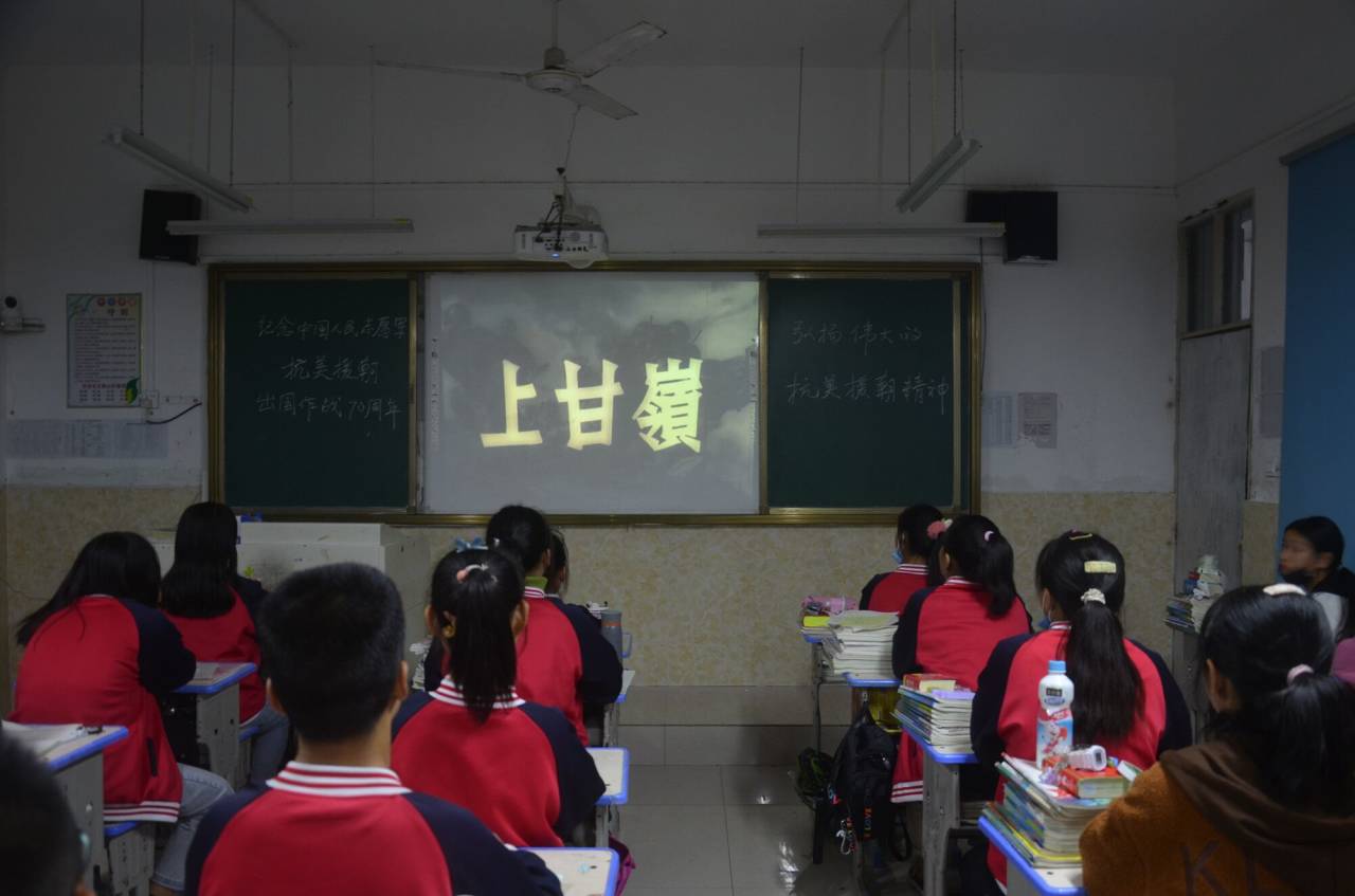 晚上,该校全体寄宿生分别在各班主任组织下观看《上甘岭》、《英雄儿女》等抗美援朝题材的电影。抗美援朝战争艰苦、战斗残酷,志愿军战士英勇无畏、视死无归等通过影片再现在学生眼前,感染学生,激励学生汲取前行力量,坚定必胜信念,传承红色基因。(图文 盛少堂;学校审核 赵斌)