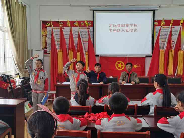 11月17日,定远县郭集学校为加强少先队阵地建设,培养新生爱队意识,为弘扬爱国主义精神,继承革命先辈的优良传统,珍惜今天美好幸福的生活,举行了一年级新生入队活动。