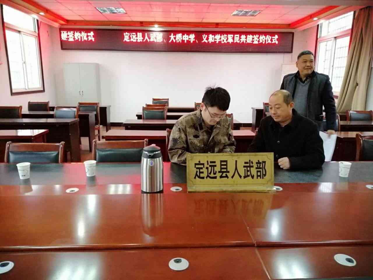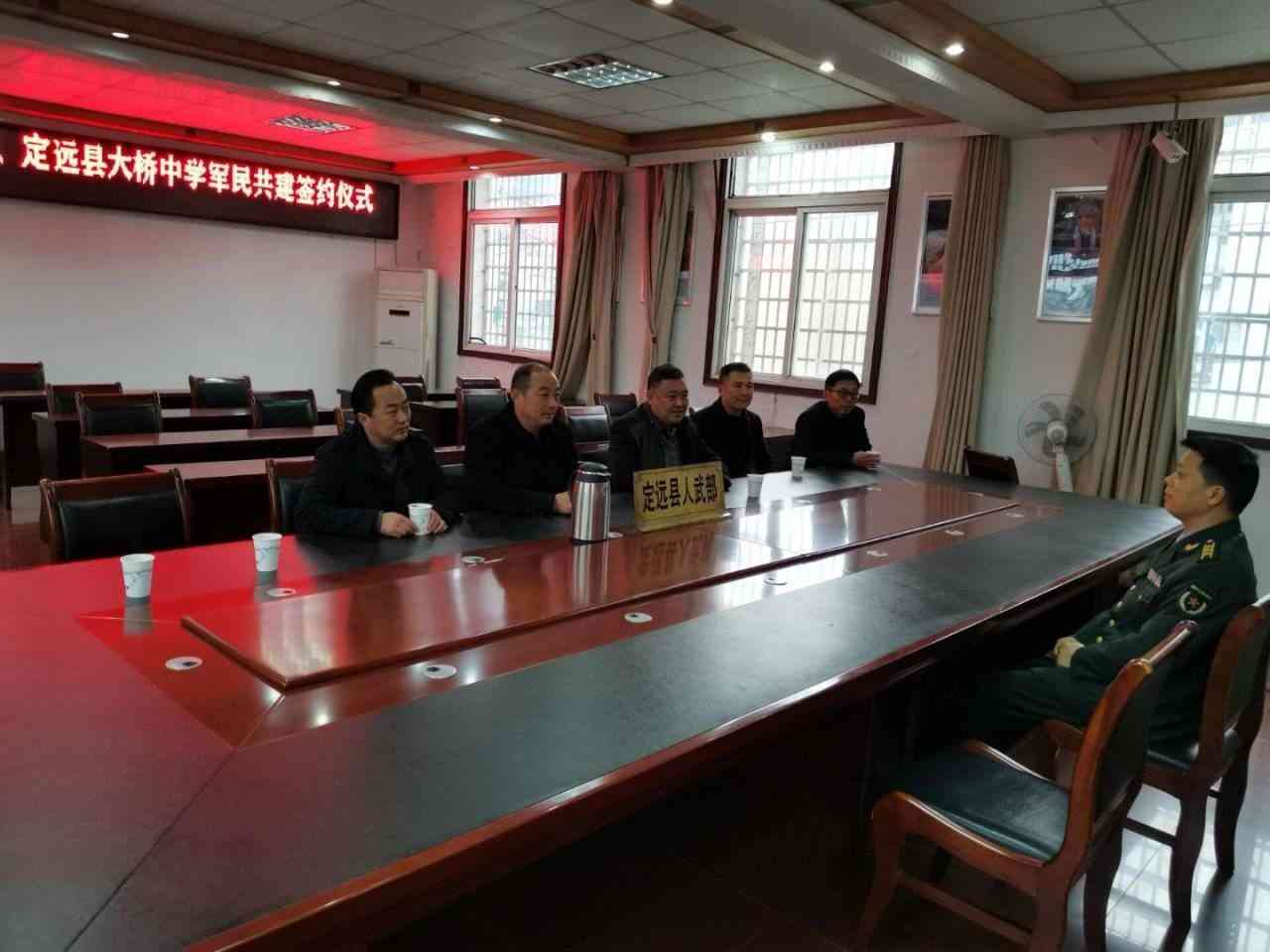 11月23日,定远县大桥初中党支部书记、校长许培铜等一行人前往定远县人民武装部开展了拥军慰问共建活动,与县人武部签订军民共建协议,并送去了问候和慰问品。