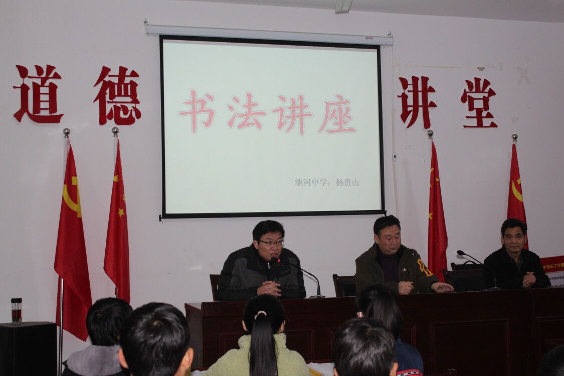 ~ 汉字之美,在于历史,汉字之美,在于传承。为了丰富校园文化生活,创建“书香、墨香”校园,弘扬中华民族传统文化,促进学生规范用字,普及书法知识,加强中小学书法教育,增进学生对祖国语言文字的兴趣。11月26日上午,定远县书法家协会会员,“定远县教体局行知书法教育志愿者服务队”队员,书法名师杨贵山老师来到池河小学,为全体师生开展了一次精彩的书法讲座。