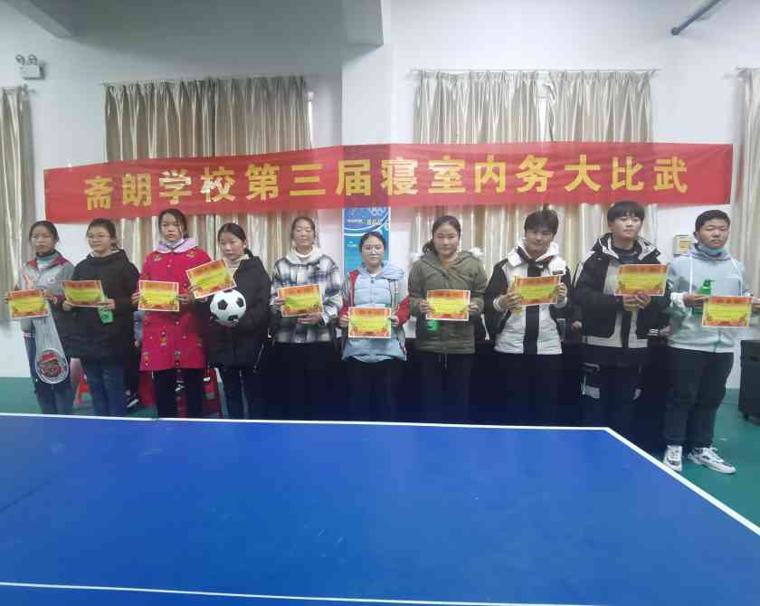 创文明宿舍,展内务风采,为进一步加强学校寄宿制管理工作,不断提升寄宿生的个人素养和集体意识,斋朗学校七~九年级全体师生在多功能体育室举行了第三届寝室内务整理大比武活动。本次活动由校长室、教导处、教师代表共同组成评审组,他们首先深入到学生寝室,对寝室物品摆放、寝室文化等进行一一检查和评分,再通过现场抽签,进行叠被子比赛。