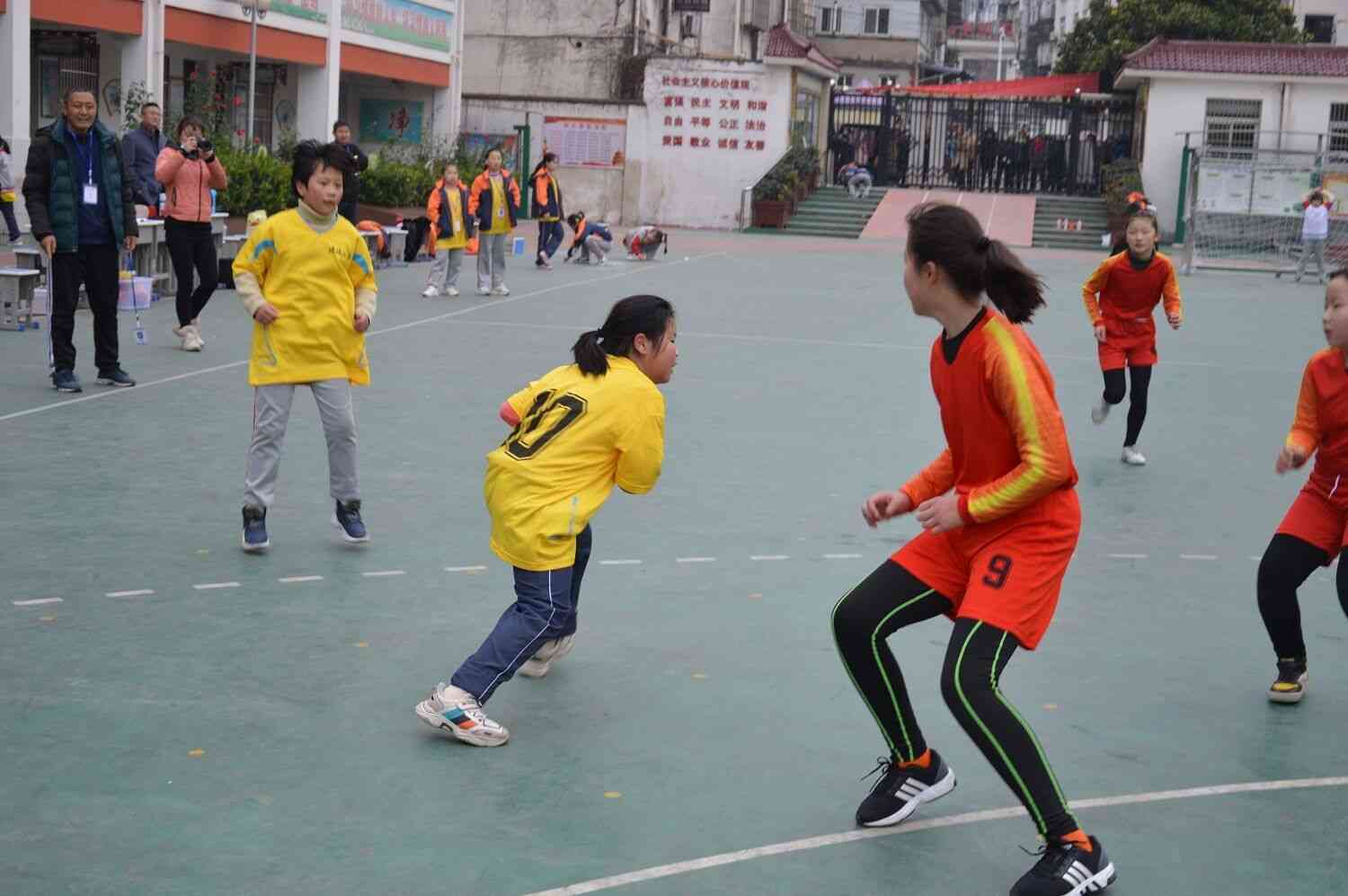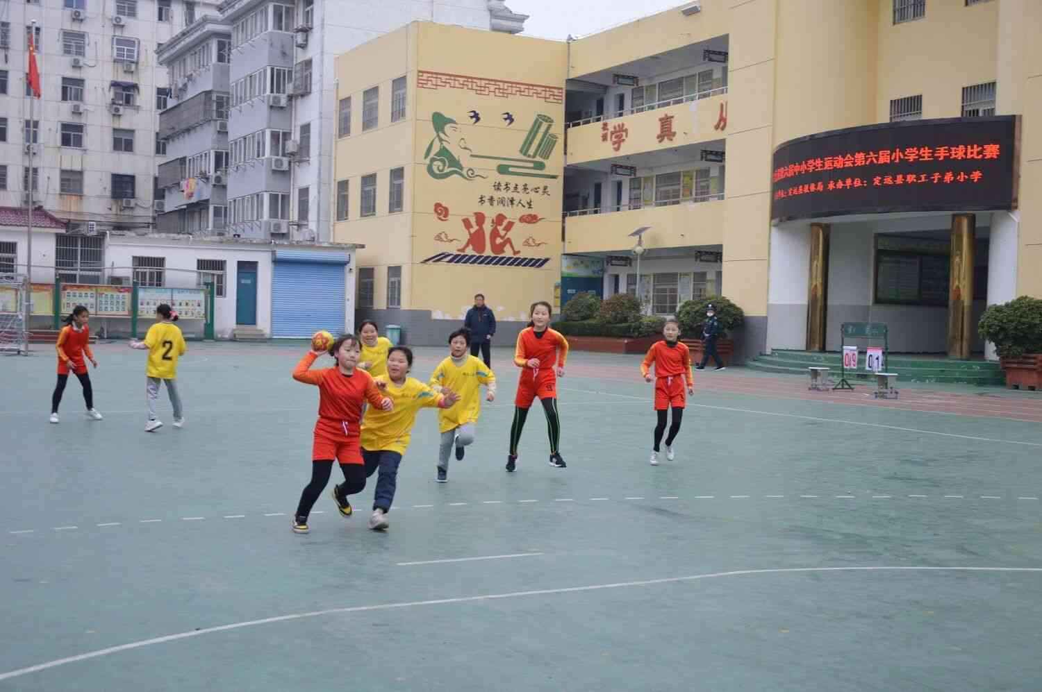 首场比赛在实验小学队和职工子弟小学小学队之间展开,随着裁判员的一声哨响,比赛正式开始,队员们合理的传球,精彩的射门,展现了手球运动在各学校的蓬勃发展。