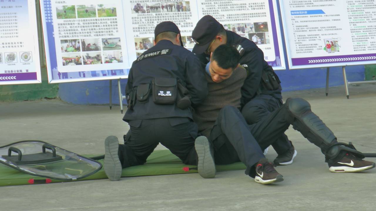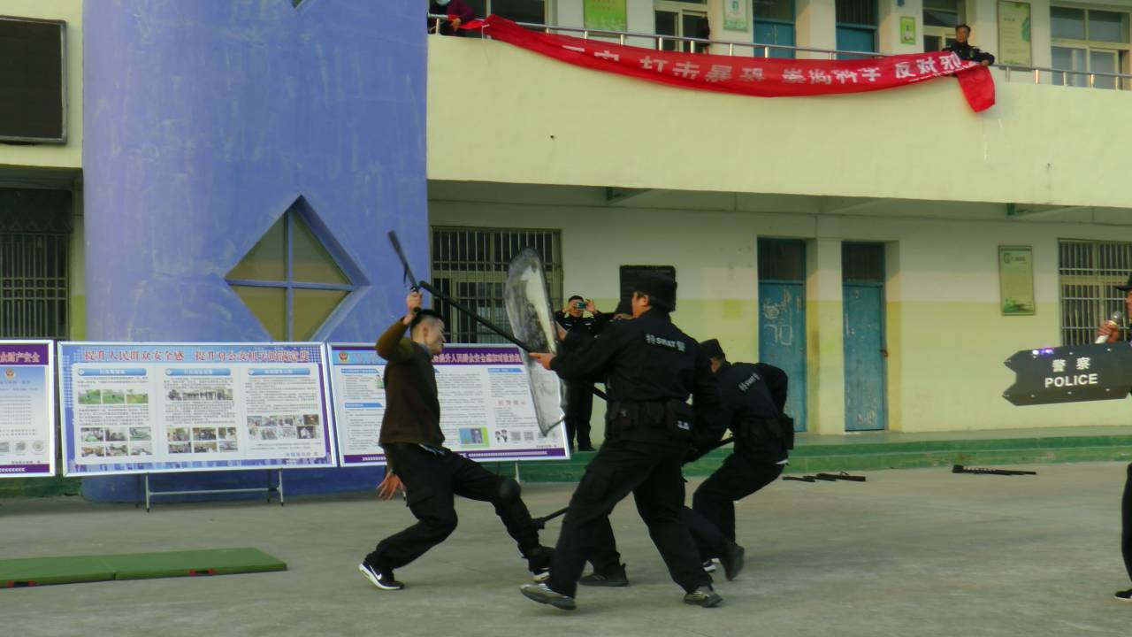 演练以学校突遇不明人员入侵并袭击师生为模拟场景,一名持棍“暴徒”进校园企图制造事端,伤害师生,特警在和“暴徒”展开周旋的同时并迅速将其制服。