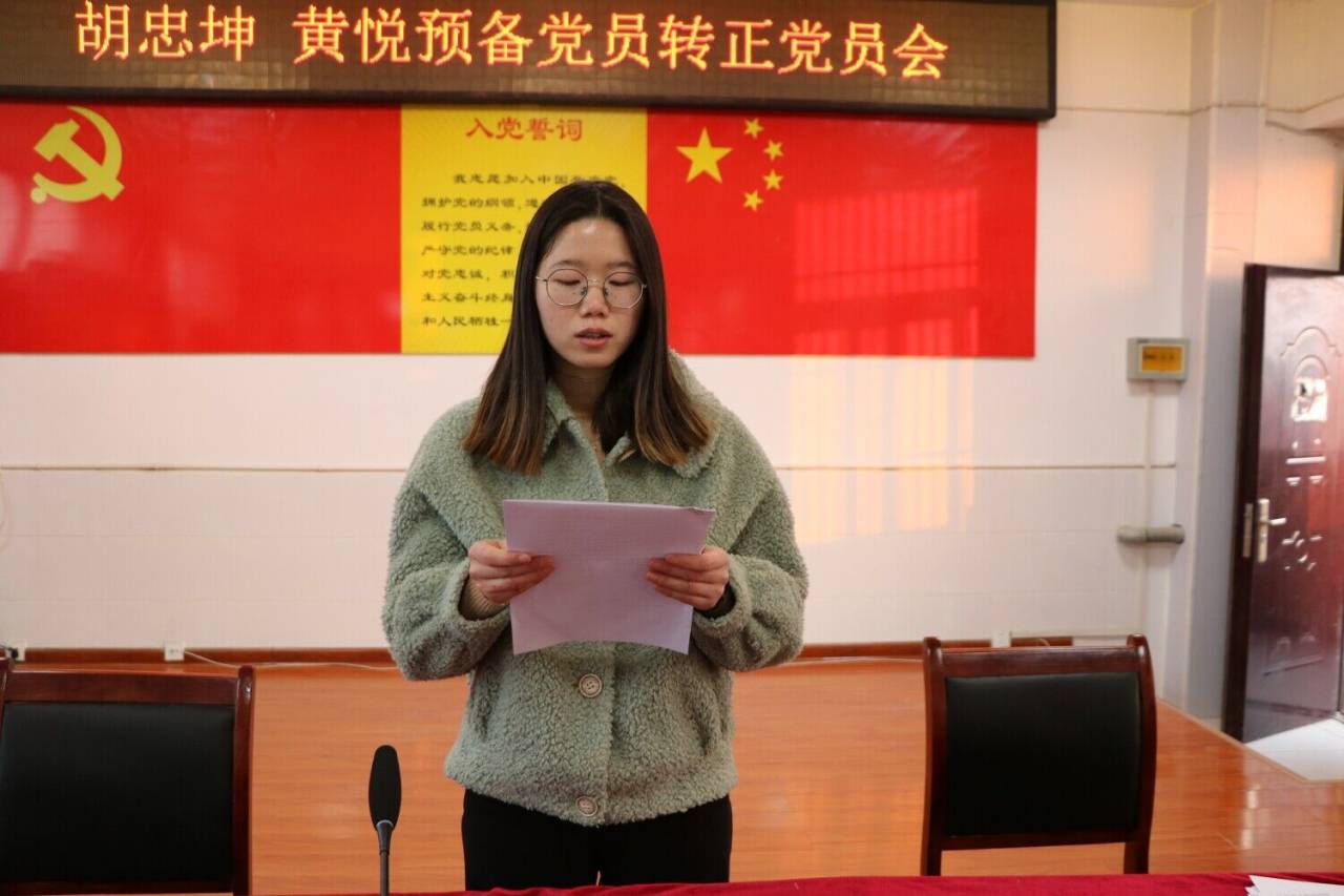 ~ 会议开始,党支部副书记胡本礼介绍了会议的主要内容及议程。接着,进入胡忠坤、黄悦同志预备党员转正的议题,两位同志依次介绍自己在预备期内的思想、学习、工作和生活情况,提出了按期转正的申请,表达了自己加入党组织的决心。会议以无记名投票表决的方式全票通过了2位同志的转正申请。