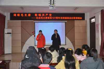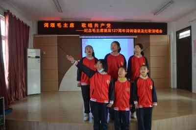 12月24日,定远县三和学校举行“词颂毛主席,歌唱共产党” 诗词诵读和红歌演唱会,以纪念毛泽东诞辰127周年,该活动由校团委牵头组织,六至九年级各班遴选优秀节目参加表演。