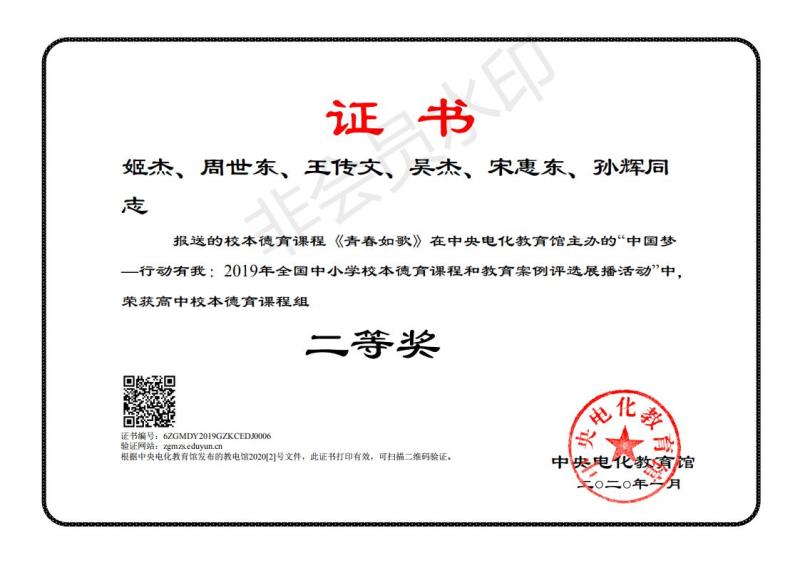 ~ 2020年1月,在中央电化教育馆公布的“中国梦——行动有我:2019年全国中小学校本德育课程和教育案例评选展播活动”优秀作品名单中,定远化工学校领导班子成员周世东、吴杰、宋惠东、王传文,以及孙辉、沈玲、姬杰、窦正林和周道婷等老师报送的作品分获高中教育案例组两个一等奖、高中校本德育课程组一个二等奖和两个三等奖。