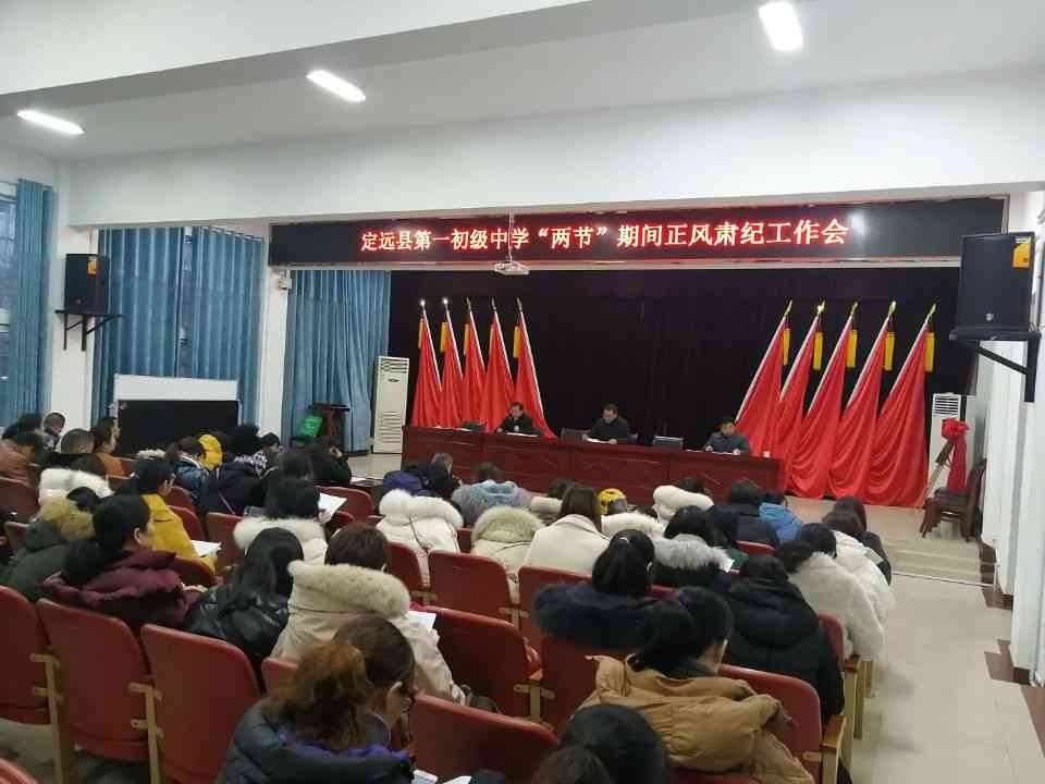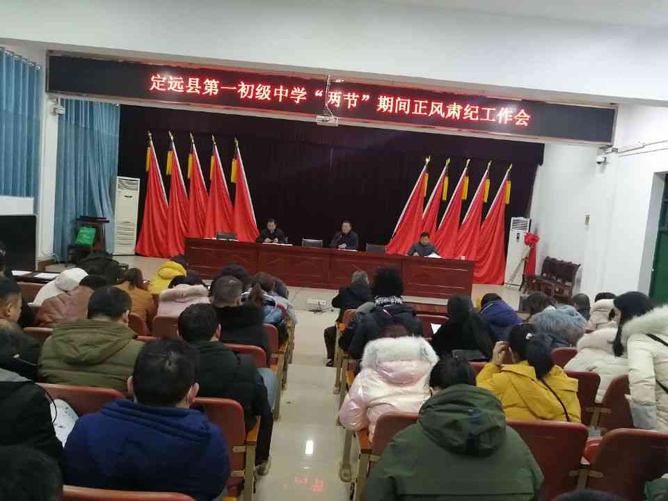 ~ 值此元旦、春节双节来临之际,1月4日,定远县第一初中先后召开了班子成员专题学习会、全体教职工大会,组织学习定远县委教体工委下发的《〈关于加强2020年元旦春节期间正风肃纪工作〉的通知》的文件精神,就严格执行八项规定、严守各项工作纪律提出了具体要求。