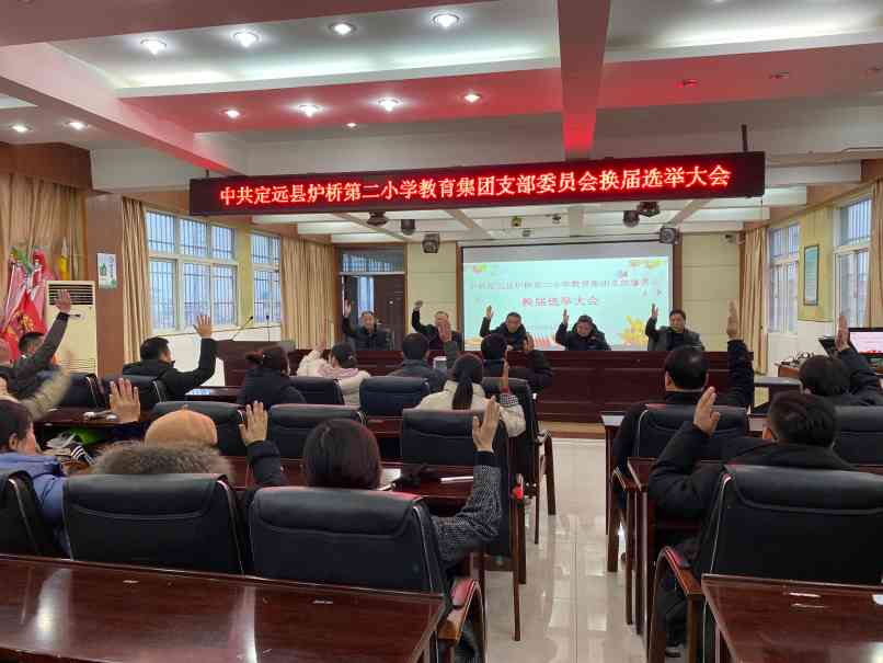 ~ 2021年1月20日下午,中共定远县炉桥第二小学教育集团党支部委员在会议室召开党支部换届选举大会,支部全体党员参加会议,选举过程由党支部组织委员李荣军主持。大会在庄严的国歌中开幕,选举前纪检委员张书云宣读《关于进一步严肃教体系统基层党组织换届纪律的通知》、组织委员李荣军宣读《中共定远县委教育体育工作委员会关于同意炉桥第二小学教育集团党支部开展换届选举请示的批复》,闫其新书记代表上一届支部做工作报告。