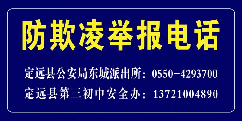 ~ 定远县教育体育局本着对校园欺凌“零容忍”的立场,要求各校把防范校园欺凌,作为学校安全工作的重中之重来抓。学校负责人亲自抓,分管负责人具体抓,明确工作重点和责任任务,采取校长包年级、学校中层干部包班级、教师包学生的方式,一级抓一级,层层抓落实,严格规范校园安全管理,突出重点时段(上课前半小时、放学后半小时、课间等)、重点部位(宿舍、校门口、校园隐秘处等)巡查值守,做到监控无死角,校园安全管理全覆盖。