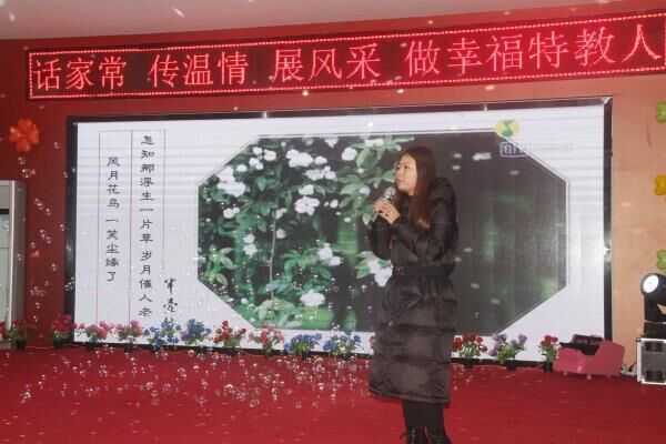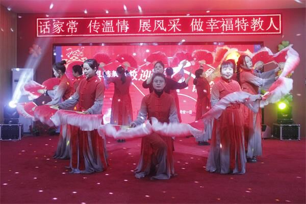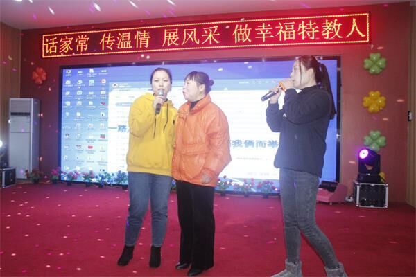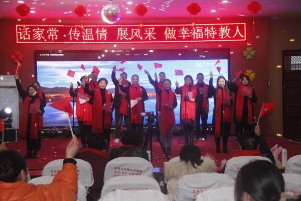 ~ 致辞和慰问结束后,教师们分部为单位展示了丰富多彩的节目:启聪部:手语歌《感恩的心》、《不放弃》;朗诵《我希望》;启智部大合唱《我和我的祖国》:康复部歌伴舞《我爱你中国》、小合唱《樱花草》;学校领导班子小合唱《感谢》;退休教师王业勤黄梅戏《民女叫冯素珍》、柏培霞老师《父亲的草原母亲的河》等节目,教师大展风采,用歌喉、巧手、语言、舞姿带来了新春的祝福,将活动推向了高潮。大家一边欣赏节目,一边畅叙友情,欢声笑语驱散了冬日的严寒,整个茶话会都洋溢着欢乐祥和的气氛。