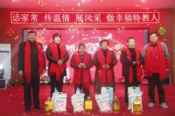 ~ 茶话会在校长谢庆贵同志的新春致辞中拉开,今年谢庆贵校长以自己改编的“爱拼才会赢”歌曲,用歌词和曲调送出新春祝福和对特教学校未来的展望,场上掌声、喝彩声不断。随后向全体教职工赠送新春吉祥围巾,并向退休教师送上春节慰问品,祝福全体教职工快乐工作,阖家幸福,牛年大吉。