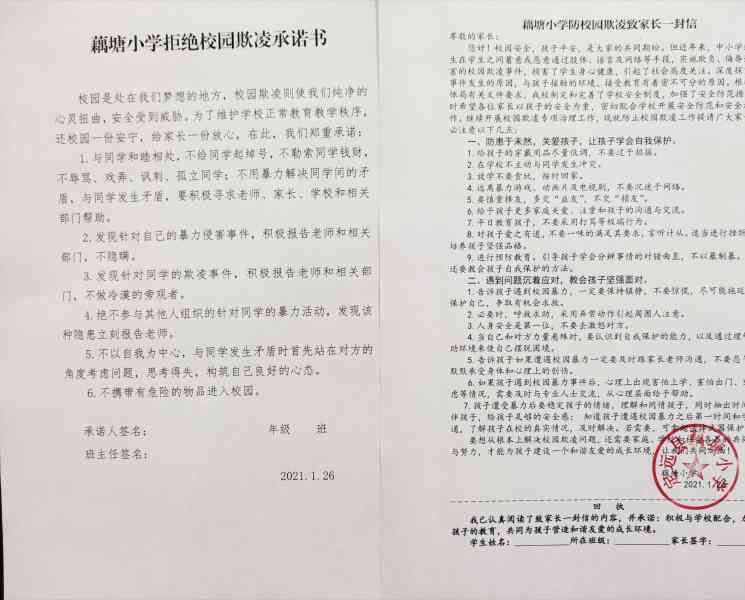 为深入推进学校防范欺凌工作,各班与班级学生签订了《拒绝校园欺凌承诺书》,同时,向所有家长发放了《防范校园欺凌致学生家长的一封信》,努力构建家庭、学校、学生三位一体的防范体系,共同构筑防范校园欺凌的坚固堡垒。(图文:赵悦 审核:罗培齐)
