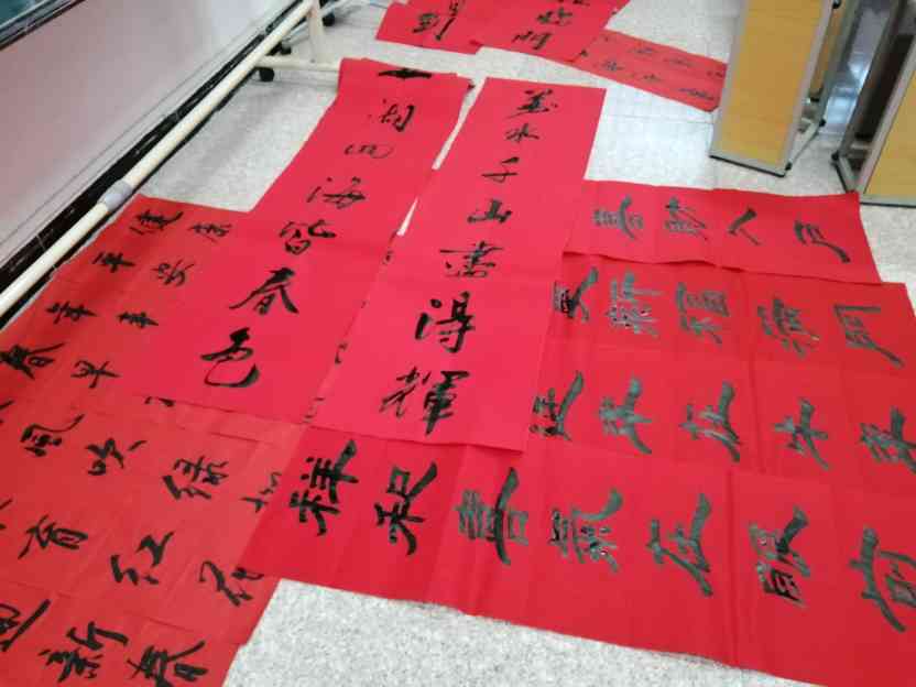 ~ 2月5日,定远县池河二小组织教师书法爱好者开展义务写春联送祝福活动,以此进一步丰富校园文化生活,传承民族传统文化。活动现场气氛热烈,大家挥毫泼墨,笔走龙蛇,或楷书,或行书,或隶书,各显风采。遒劲的线条描绘出一幅幅对联、一张张福字、一句句祝福。春联内容既有喜迎牛年辞旧迎新的美好愿景,也有平安吉祥、和谐发展的励志高歌。一幅幅对仗工整而又饱含新春祝福的书法作品,为即将来临的春节增添了浓浓的春节氛围。