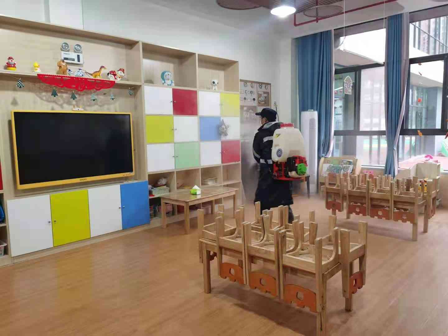 ~ 伴随着机器的轰鸣声和弥散的消毒液气味,队员们严格按照卫生消杀管理的标准规范操作,身着防护设备、背负40余斤重的消毒设备,对滁州二小和附属丰山幼儿园的教室、实验室、办公室、食堂、各功能室等人群密集性区域进行重点消杀,对校园、卫生间、楼道等公共部位进行细致消杀,做到不留盲区、不留死角,确保切断病毒的传播途径,降低交叉感染的风险。虽然阴雨绵绵,加之密不透气的防护服,让队员们早已汗流浃背,但他们依旧以认真负责的态度,高标准、高质量完成防疫消杀工作,为全校师生创造卫生健康的工作、学习、生活环境。(