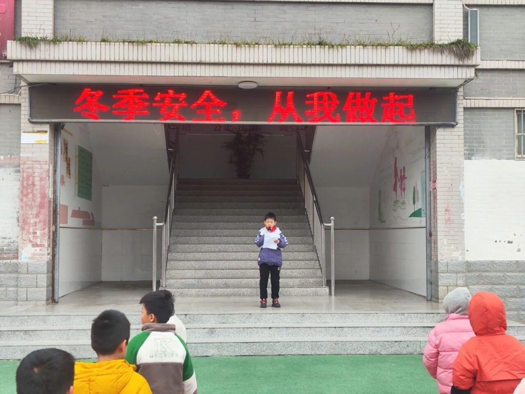 ~ 会议当日,炉桥二小还利用国旗下讲话契机,开展了以《冬季安全,从我做起》为主题的安全教育活动,四年级(6)班学生代表作了主题发言,倡议全体同学增强安全意识,从自身做起。
