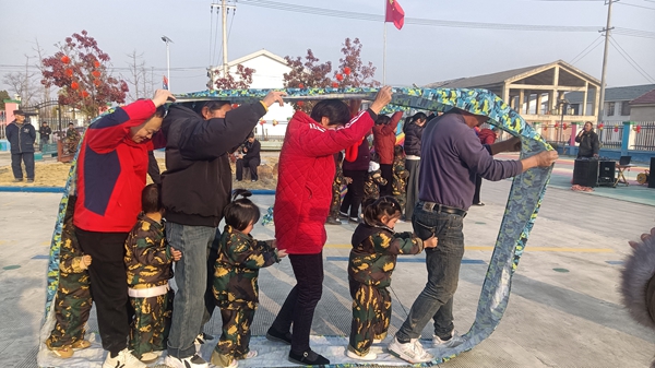 ~ 活动伊始,大家在庄严的国歌声中,进行了国旗注目礼。接着在幼儿园小朋友们的开场舞蹈中,亲子互动游戏缓缓拉开帷幕,园区内变成了一个充满奇幻与乐趣的游艺天地。家长和孩子们齐心协力,共同完成了接力过障碍、强渡大渡河、旋转风火轮等形式多样的亲子互动游戏,既锻炼了孩子们的身体协调,又强化了他们的思维能力。现场加油声、欢笑声此起彼伏,家长们不时举起手机记录精彩瞬间,掌声与喝彩充满了整个会场。本次元旦亲子活动是该园“家园共育”的重要桥梁,希望通过这样轻松愉快的形式,让孩子们在体验与互动中了解节日文化,感受亲情与陪伴的温暖,也让家长更深入地了解孩子在园的日常生活。