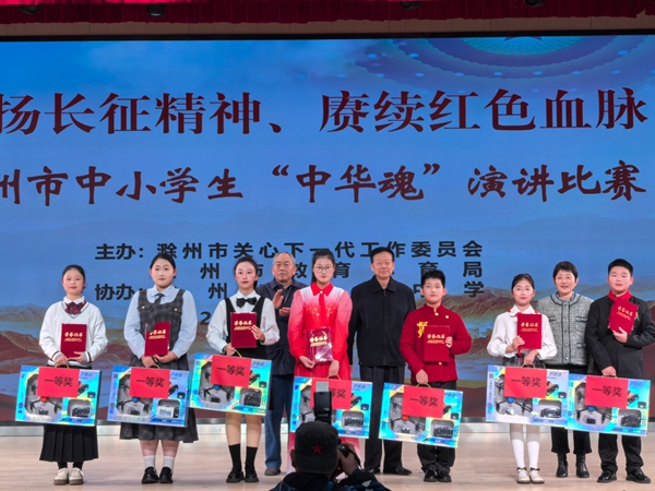 ~ 12月30日上午,由滁州市关心下一代工作委员会、滁州市教育体育局联合主办的全市中小学生“中华魂”演讲比赛在市敬梓中学报告厅隆重举行。比赛内容以“弘扬长征精神、赓续红色血脉”为主题,来自全市各县(市、区)及市直学校的优秀学子齐聚一堂,以青春之声深情颂扬伟大长征精神,展现新时代青少年的精神风貌与爱国情怀。