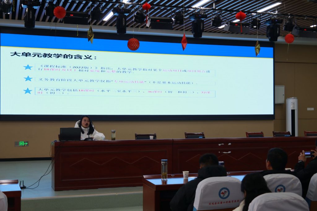 ~ 活动伊始,李主任为在坐的教师带来了《体育与健康大单元教学设计与实施》的讲座,带领教师们再次学习《体育与健康课程标准(2022版)》,强调“学、练、赛、评”一体化设计与核心素养的落地。系统解析结构化教学设计与实施路径,助力教师从理论走向课堂实践。