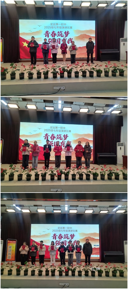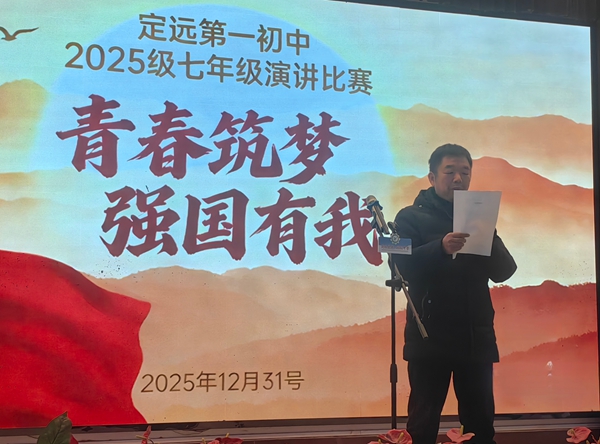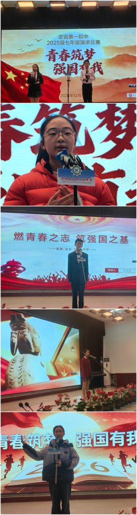~ 为厚植家国情怀,展现青春风采,2025年12月31日下午,定远县第一初级中学七年级“青春筑梦,强国有我”主题演讲比赛在校园内精彩开赛。18名班级代表选手齐聚赛场,以昂扬之姿传递少年壮志,用铿锵之声诠释强国担当。