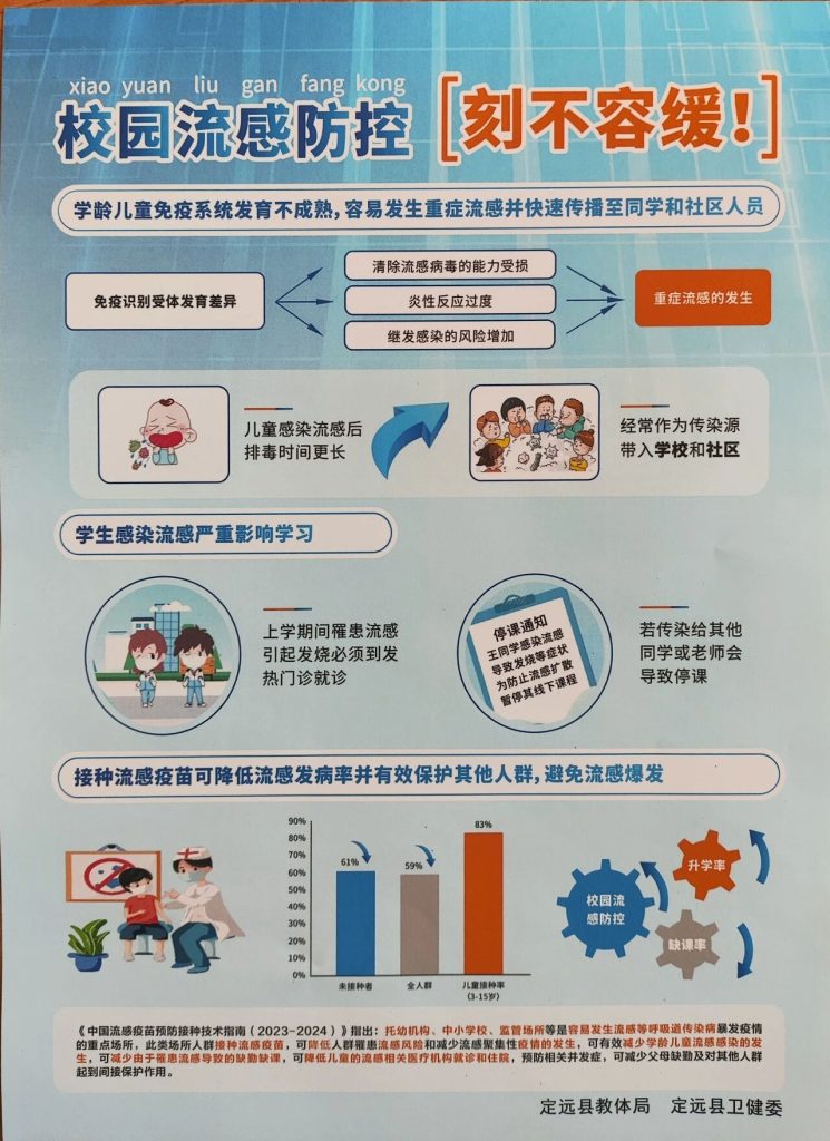 ~ 本次宣传活动所使用的《定远县2025年流感疫苗接种家长告知书》《关于流感疫苗接种的一封信》等相关资料,由定远县教育体育局与县卫生健康委员会联合编制印发,确保了信息的权威性与科学性。活动中,各班级通过主题宣讲、材料发放等形式,向学生详细讲解流感防控知识及疫苗接种的重要性。