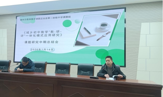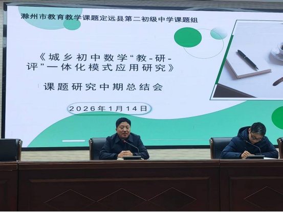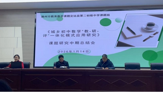 ~ 为全面梳理课题阶段性研究成果,精准剖析现存问题,稳步推进后续研究工作,2026 年 1 月 14 日下午,《城乡初中数学“教-研-评”一体化模式应用研究》课题中期总结会在定远县第二初级中学报告厅召开。会议由周成洋副校长主持,校领导、课题组全体成员参加会议。