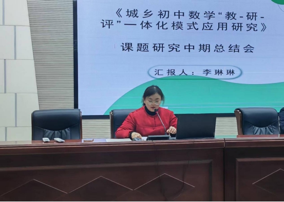 ~ 课题负责人李琳琳就课题组前期工作情况进行了汇报。她指出,课题直击城乡数学教育资源不均、教研壁垒突出、评价体系单一三大痛点,确立了“教为载体、研为动力、评为反馈” 的核心逻辑,通过全面调研、细化分工,顺利完成了前期调研与模式雏形构建,正式迈入试点应用阶段。 汇报中,李琳琳老师重点分享了研究成效:一是构建起一体化理论雏形,明确 “提升学生核心素养” 总目标及城乡互补、因材施教等四大实施原则;二是搭建差异化实践模式,县城端侧重 “精准教学 + 深度教研 + 多元评价”,乡村端聚焦 “基础夯实 + 靶向教研 + 分层评价”,形成 “课前研、课中践、课后评” 的闭环流程;三是沉淀可复制教学范本,通过联合备课、同课异构形成典型课例;四是参研教师专业能力显著提升,多人在各级教学成果评选中斩获佳绩,7 名教师入选县级名师工作室,示范引领作用凸显。