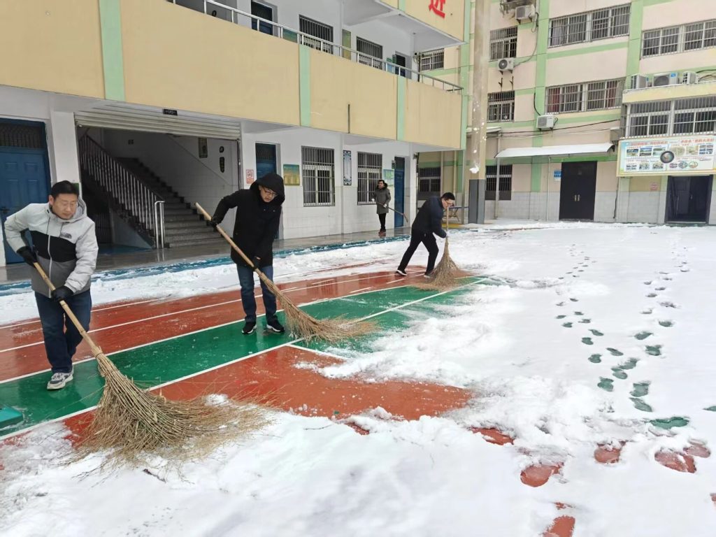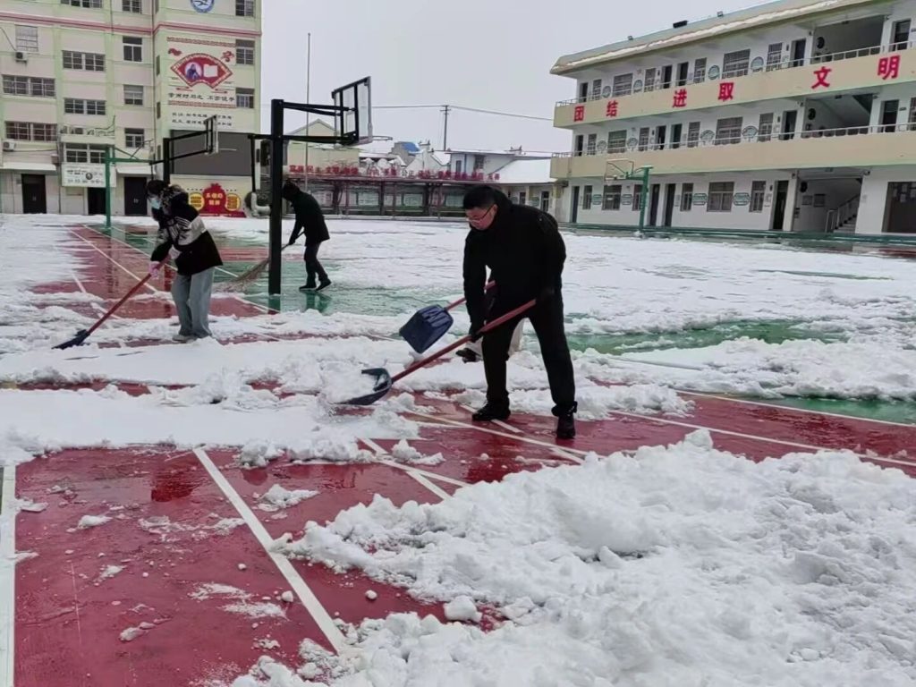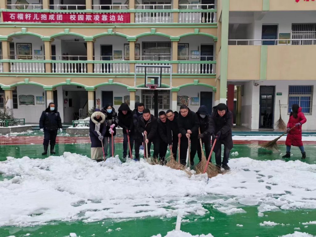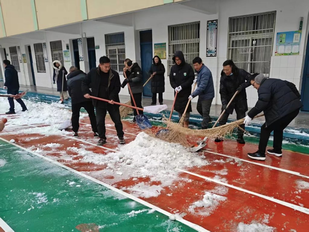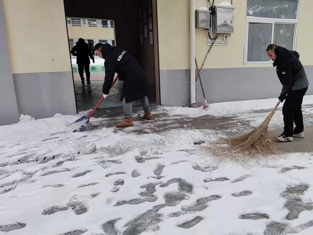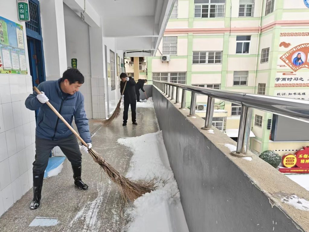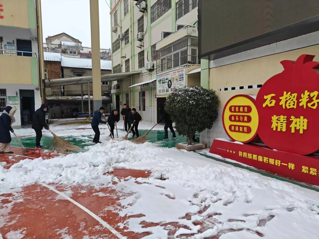 ~ 近日,寒潮来袭,积雪覆盖校园。1月20日,定远县民族小学党支部迅速行动,组织全体党员和教师志愿者到校清扫校园积雪。劳动中,大家不畏严寒,热情洋溢,用实际行动诠释了民族小学“石榴籽精神”,展现了“团结进取、文明和谐”的优良校风。