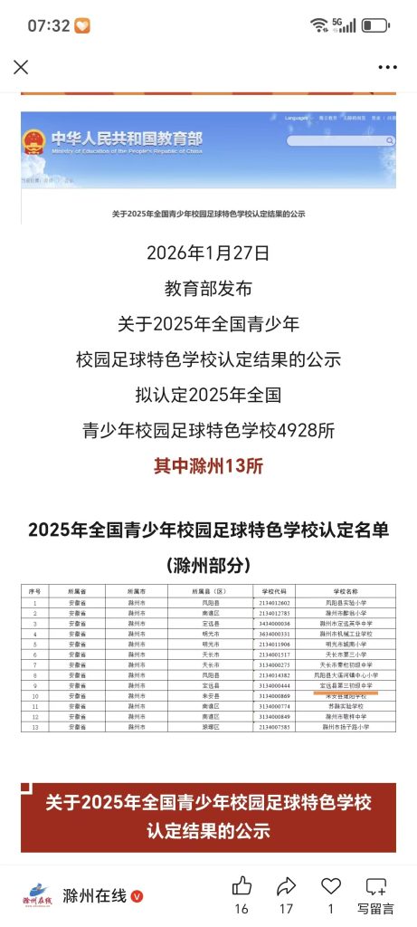 ~ 捷报传喜讯,绿茵谱新篇!根据教育部《关于开展2025年全国青少年校园足球特色学校遴选工作的通知》要求,经学校自主申报、专家评审、省级教育行政部门审核推荐等严格程序,定远县第三初中凭借扎实的校园足球办学基础、鲜明的育人特色与丰硕的实践成果,成功入选2025年全国青少年校园足球特色学校公示名单(公示期:2026年1月27日至2026年2月2日)。