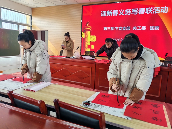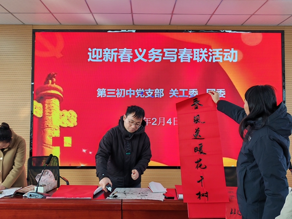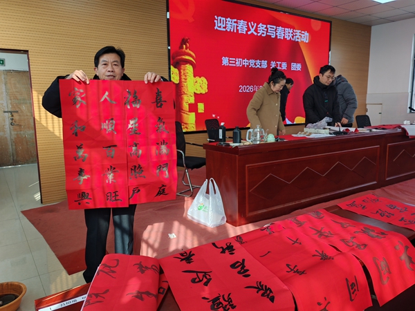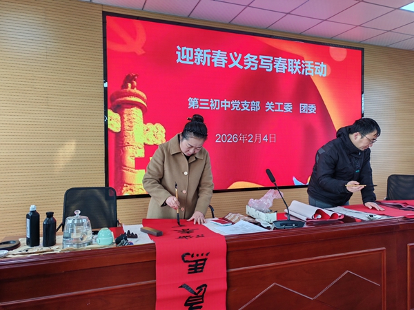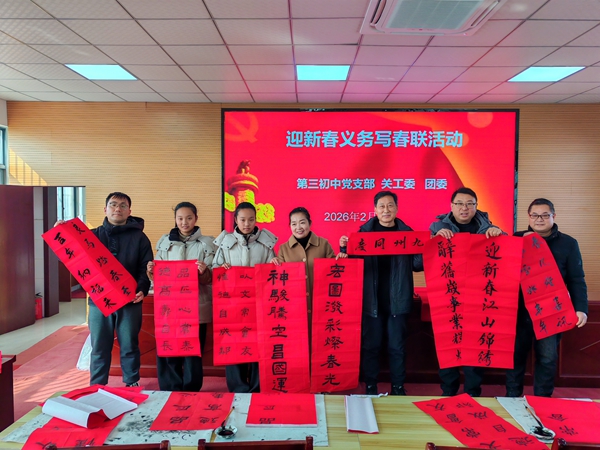 ~ 此次活动既是该校“书香校园”建设与书法特色教育的实践延伸,更是践行志愿服务精神、深化校社联动的生动举措,既展现了该校教职工的文化素养与党员责任担当,又以传统民俗形式弘扬中华优秀传统文化,为即将到来的丙午马年增添了浓厚年味。(供稿:第三初中宣传中心 初审:杨维跃 审核:储群芳 审签:刘成功)