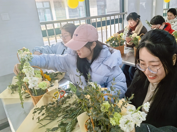 ~ 随后,专业花艺老师亲临现场授课,细致讲解花材搭配、修剪技巧与插花构图,同时讲解各类花卉的花语寓意,将真挚祝福融入花艺教学之中。在老师的专业指导下,老师们巧手修枝、创意搭配,沉浸式感受花艺乐趣。