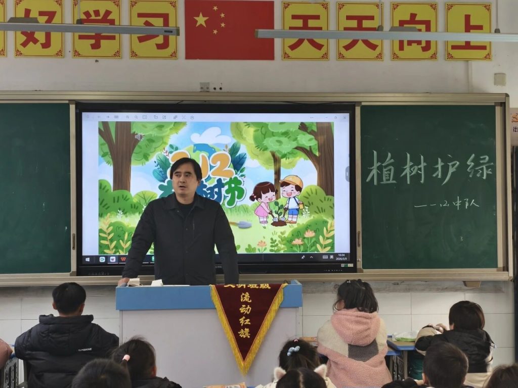 ~ 开展“知绿植绿”主题队会。3月9日,各中队辅导员利用队会开展植树节专题教育。辅导员们带领同学们深入了解植树节的由来、植树所需工具、规范种植方法,细致讲解植树造林的生态意义与护绿爱树的重要性,让环保理念扎根学生心底,让每一位队员都成为绿色文明的传播者。