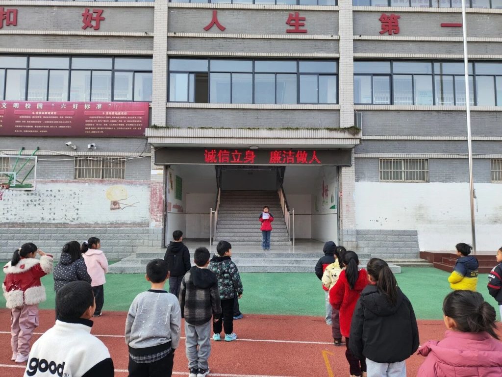~ 庄严的国旗下举行了”诚信立身,廉洁做人”主题教育活动,定远县炉桥二小教育集团五(1)班学生代表陶思蕊向全校师生发表了主题演讲。