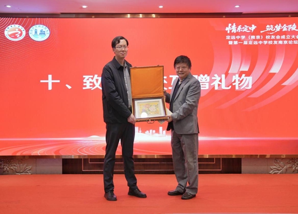 ~ 寸心报春晖,一物寄深情;母校育我成长,我以真情回馈,施国庆、鲍观泽分别代表定远中学(南京)校友会和定远中学互赠了具有象征意义的礼物(礼物寓意:希望定中学子带着德才并美、知行合一的校训品德报考文蕴金陵、学养深厚的南京各大高校) 。