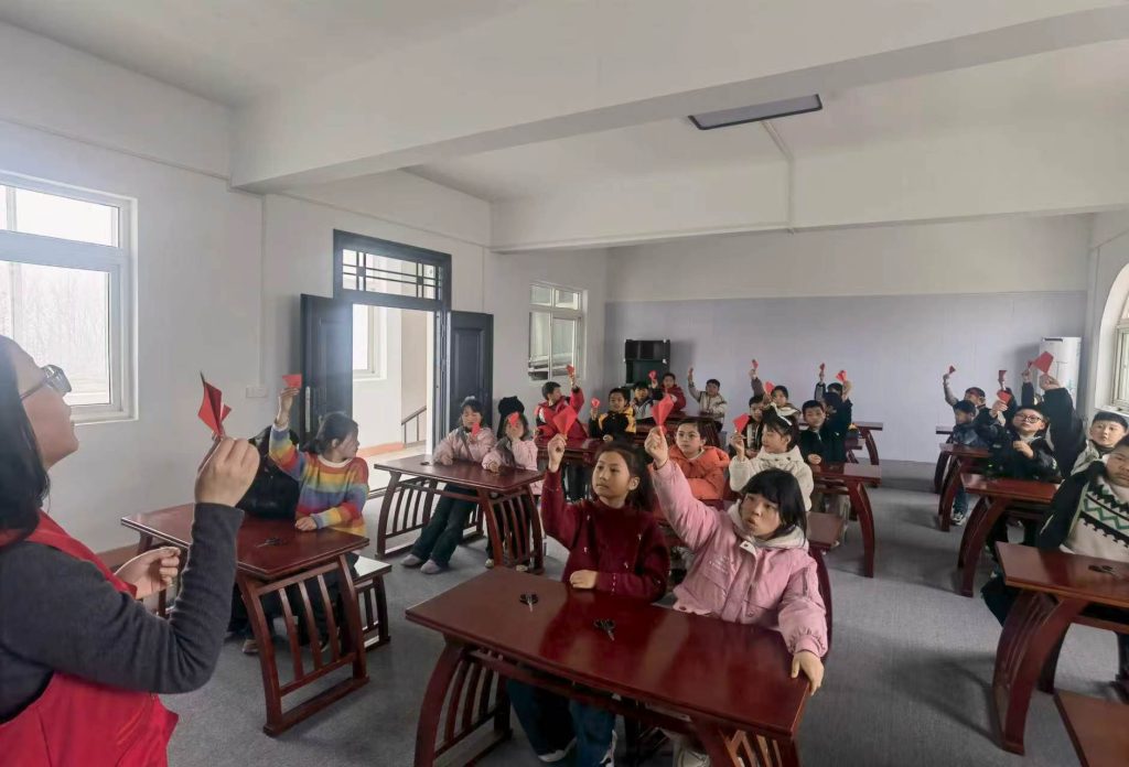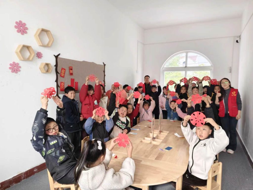 ~ 课堂上,志愿者以剪纸起源、民俗寓意为切入点,结合朱湾本土文化元素,生动讲解折纸、画稿、裁剪等核心技法,通过“一对一”示范指导,拆解“折、剪、刻”关键步骤。孩子们手持彩纸与剪刀,神情专注地勾勒线条、细心雕琢,一张张普通红纸在指尖化作吉祥窗花,纸屑如花瓣般飘落,现场洋溢着浓厚的创作氛围。