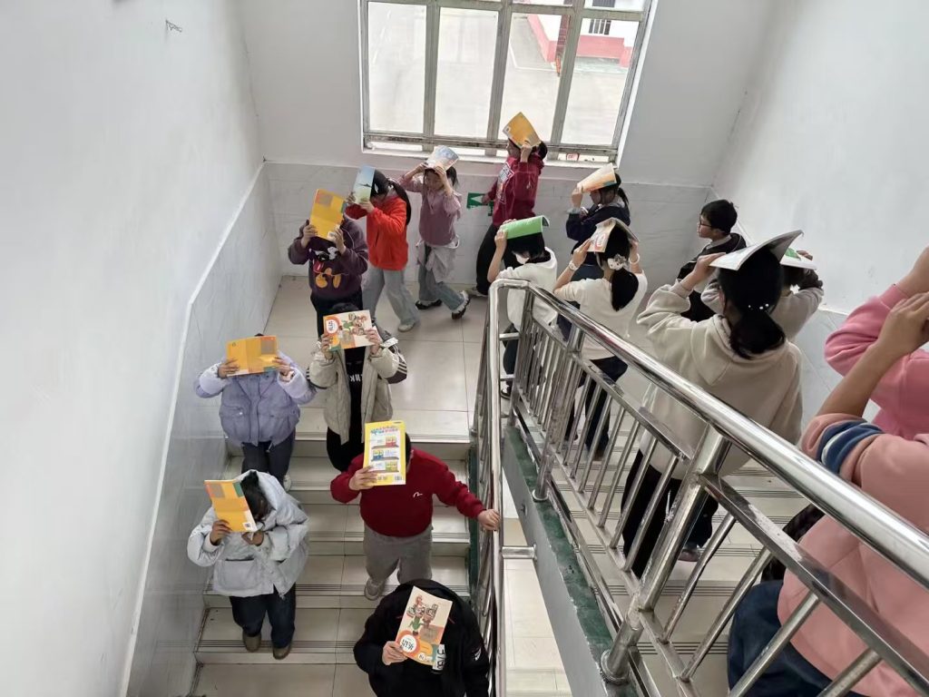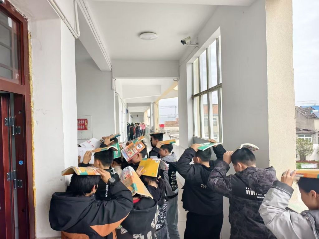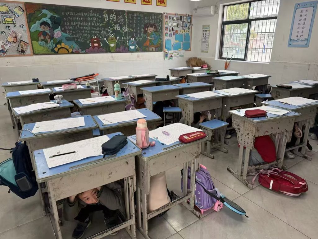 ~ 随着警报声响起,全体师生迅速进入应急状态。教室里,学生们立即蹲到课桌下方,双手护住头部。约一分钟后,疏散指令下达,各班学生在老师引导下,沿着预定路线快速有序地向操场撤离。楼道里,大家不推挤、不喧哗,整个过程井然有序。到达安全区域后,各班清点人数并逐级上报。