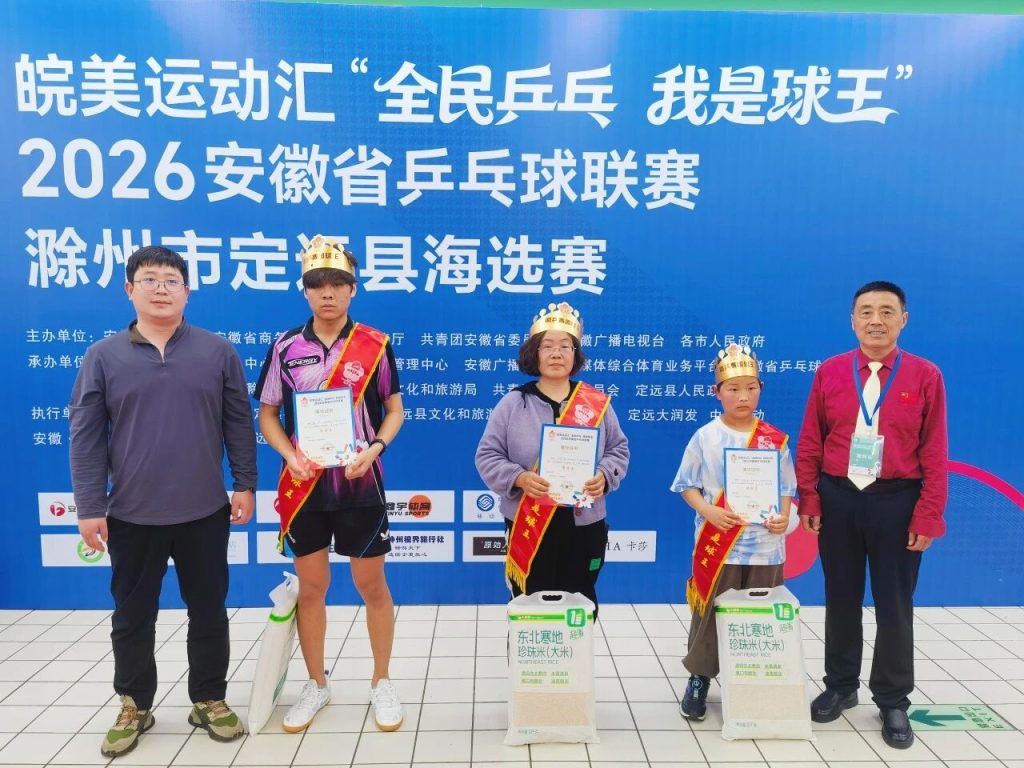 ~ 4月12日,“徽乒赛”定远县海选赛第四轮战罢,又有六名“草根球王”脱颖而出,其中定远化工学校2026届毕业生、合肥师范学院乒乓球专业录取新生谢杰过五关斩六将,荣登成人组男子单打“周球王”宝座,再次集中彰显了定远化工学校一直以来贯彻体教融合、办好人民满意教育的丰硕成果。