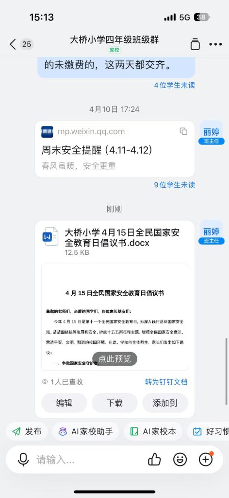 ~ 学校积极搭建家校共育桥梁,向家长发放安全倡议书,开展国家安全、法治安全家校联动宣传,引导家长履行监护责任,扎实做好居家安全教育。家校同心同行、携手并肩,共同守护学生身心健康成长。