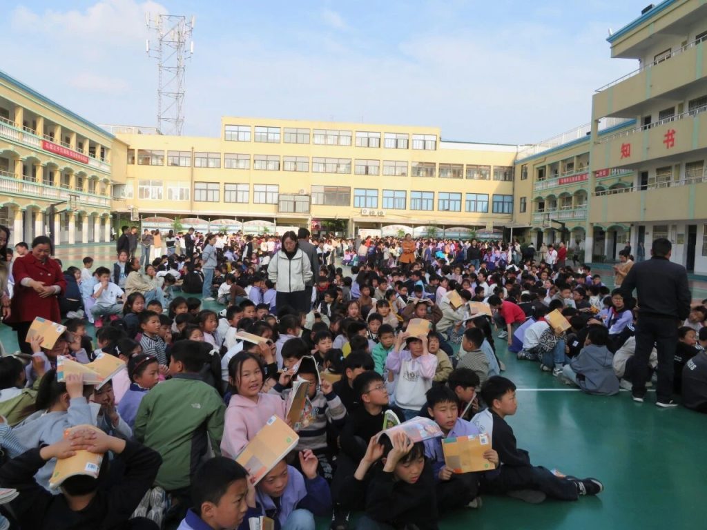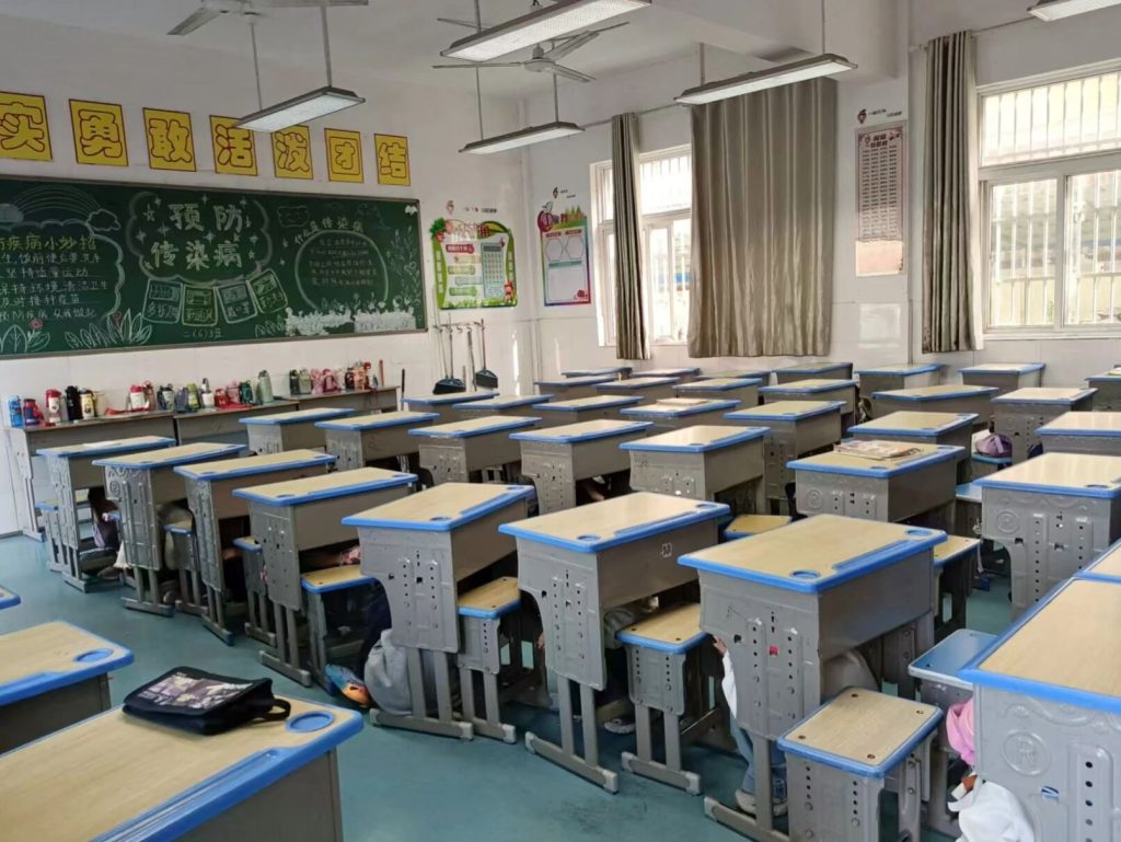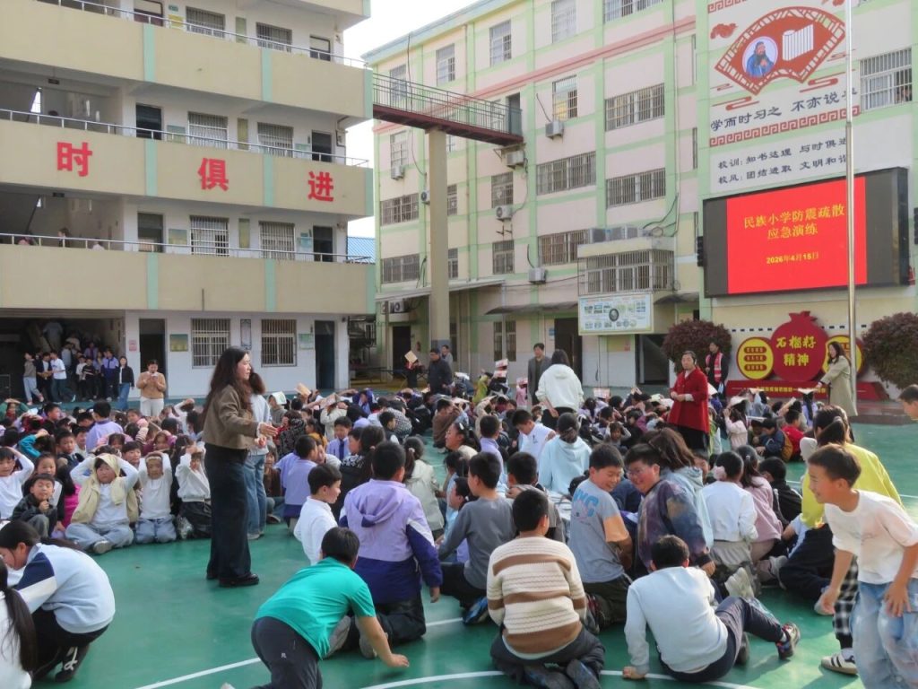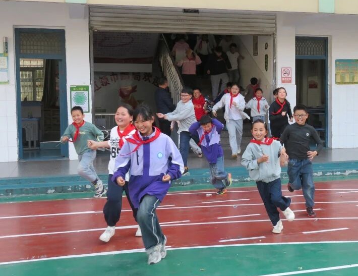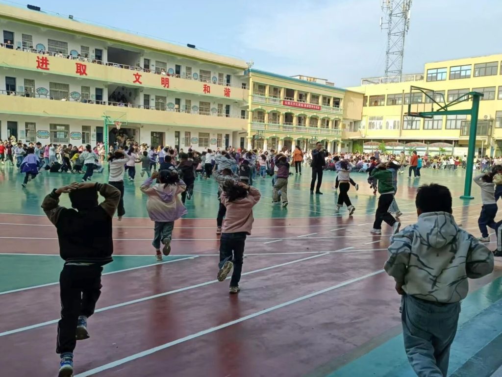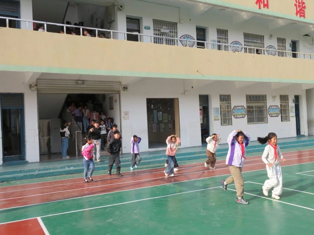 ~ 当“地震警报”信号在校园响起,全体师生迅速进入应急状态。同学们在老师的指挥下,立即抱头、闭眼,躲在课桌下或课桌旁。随后,各班老师引导学生按照预定路线快速撤离到操场中央安全区域。整个过程紧张而有序,1800多名师生全部撤离用时2分11秒,达到了预期的效果。