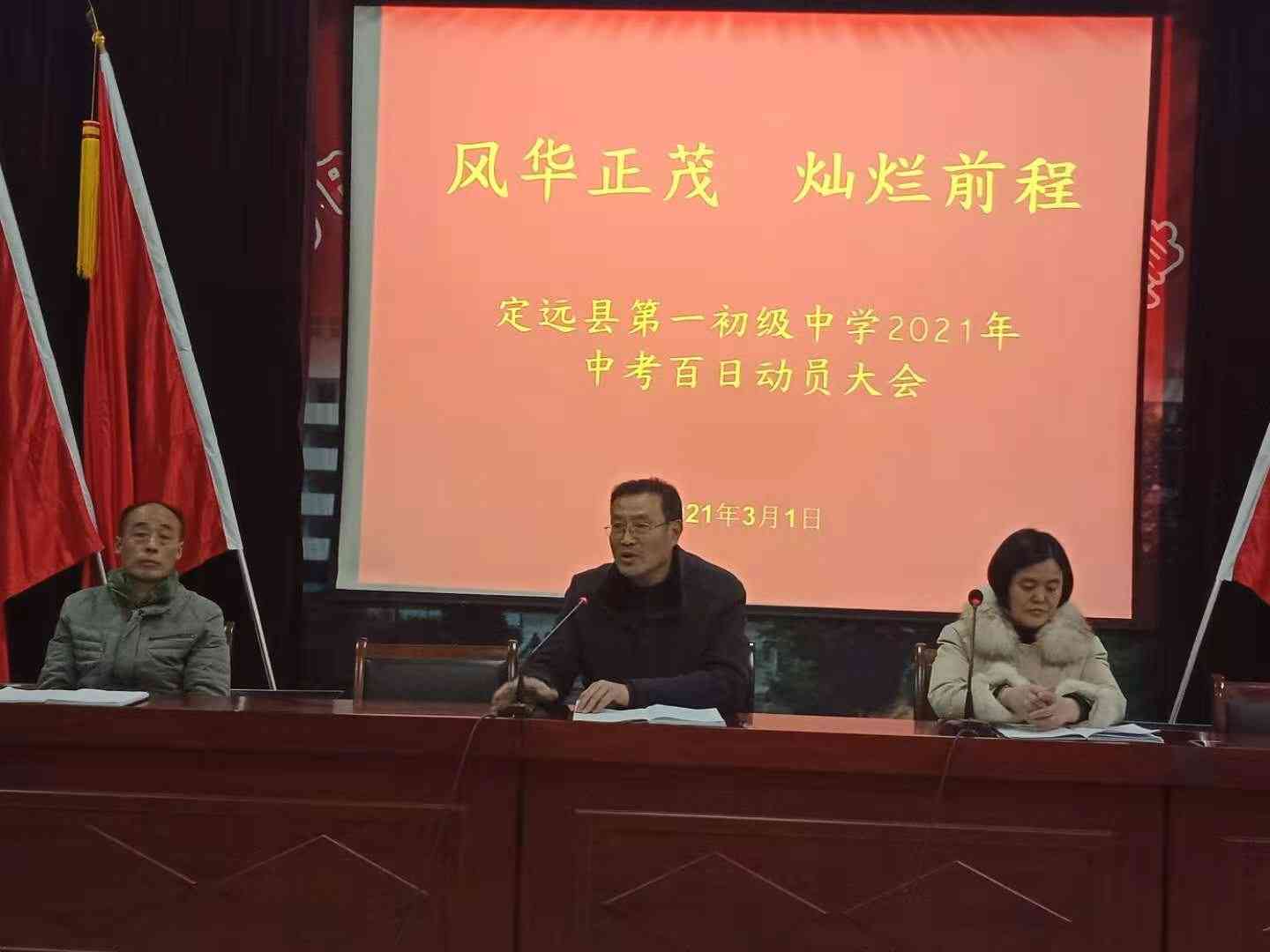 ~ 3月1日,定远县第一初中在科技楼报告厅举行了中考百日动员大会。校支部书记、校长张书清、九年级全体班主任、九年级学生代表参加了会议。会议由九年级年级副主任沈怀米老师主持。
