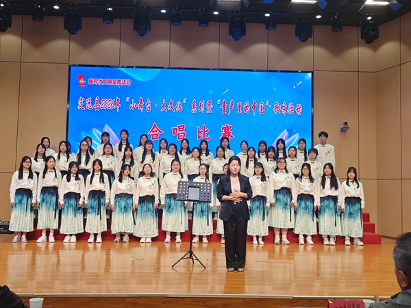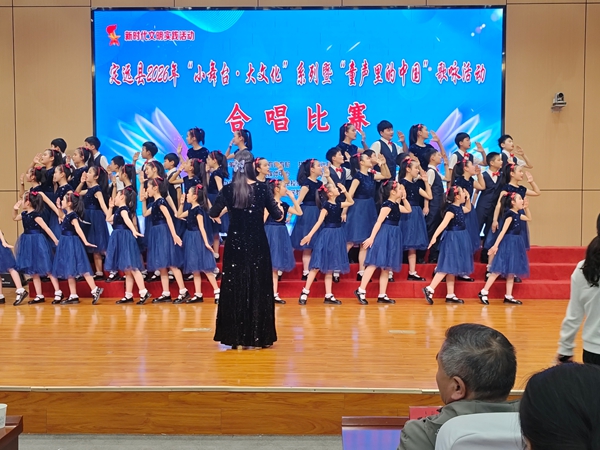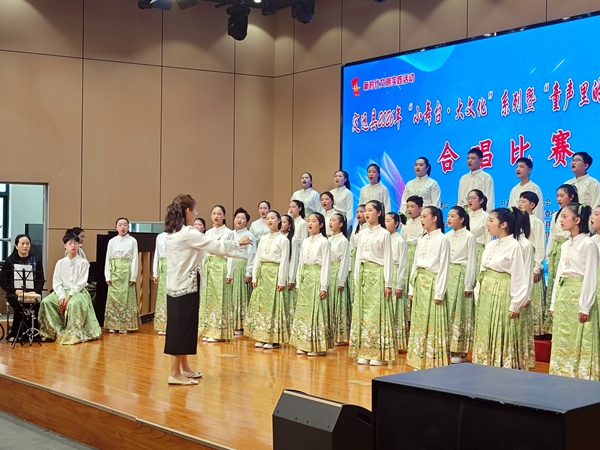 ~ 尤为亮眼的是,本届比赛在艺术形式上大胆创新、深度融合。多支代表队巧妙融入民族乐器与地方戏曲元素,极大提升了作品的文化厚度与听觉美感:钢琴、笛子、鼓、钹等传统乐器的现场伴奏,为合唱作品注入典雅韵味;戏曲非遗的特色唱腔被有机嵌入现代合唱中,既保留时代气息,又彰显地域文化根脉;更有队伍将戏曲念白、身段动作与合唱编排巧妙结合,使舞台呈现更具戏剧张力与审美层次。这种“合唱+民乐+戏曲”的跨界融合,不仅展现了师生对中华优秀传统文化的创造力,也标志着我县学校美育正从“唱得好”迈向“演得深、融得巧、传得远”的高质量发展阶段。